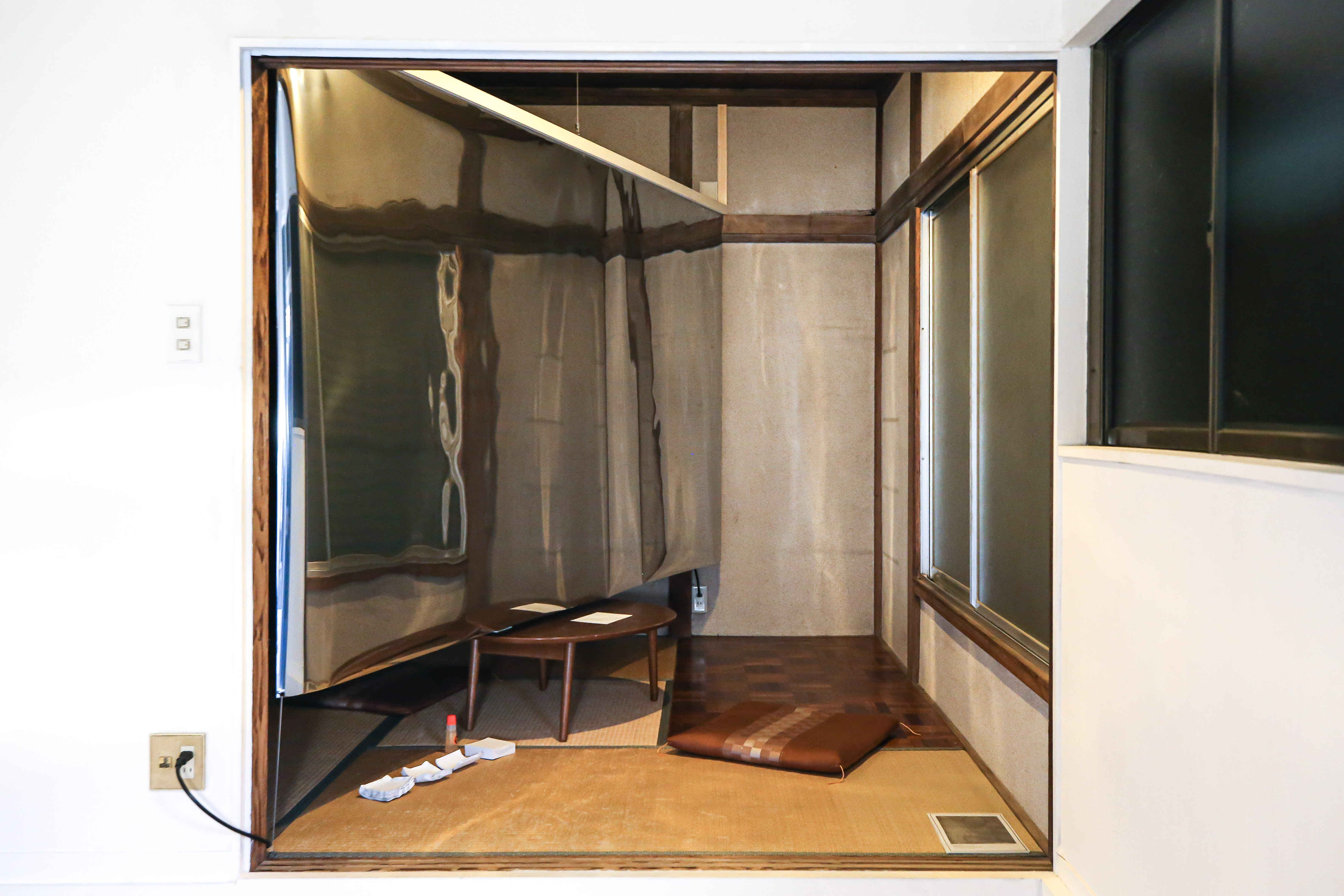 マジックミラーは別名ハーフミラーと言って、光を反射させるだけではなく、透過もさせる鏡のことだ。窓ガラスを考えるとわかりやすいが、環境によっては向こう側の様子が見えず、逆に自分の姿が反射して映り込む。透過する光よりも反射する光の方が多いからだ。マジックミラーには「裏表」や「鏡面 / ガラス面」といった定位置はない。周囲の環境が明るければ鏡に近づき、暗ければガラスに近づく、そのようなシート。照明が落ちている間、相手の輪郭がなんとなく見えるのだが、明るくなると自分が映る。でもこれは、「告白」をさせようという空間にしてはーーあるいは安心して話をしようという構えとしてはーーとても奇妙で、水を差す仕組みじゃないだろうか。